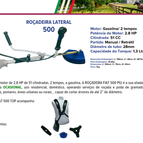 Fortes, Robustas e Potentes, motor de 2,8 HP de 51 cilindradas, 2 tempos, a gasolina, A ROÇADEIRA FIAT 500 PIU é a sua aliada para manter seu espaço externo impecável, indicada para uso OCASIONAL, uso residencial, doméstico, operando serviços de roçada e poda de gramados, matos, capins, na limpeza e manutenção de pastos, jardins, pomares, áreas urbanas ou rurais, , capaz de cortar árvores de até 2” de diâmetro.